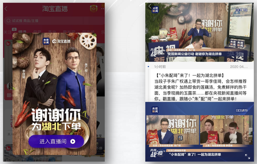 鱼米之乡的湖北是中国重要农产品生产地。受疫情影响,湖北经济面临极大困难,优质的农副产品无人问津。2020年4月6日和13日,总台“央视新闻”为助力湖北经济复苏,推出“谢谢你为湖北拼单”公益直播,首次开启直播带货。