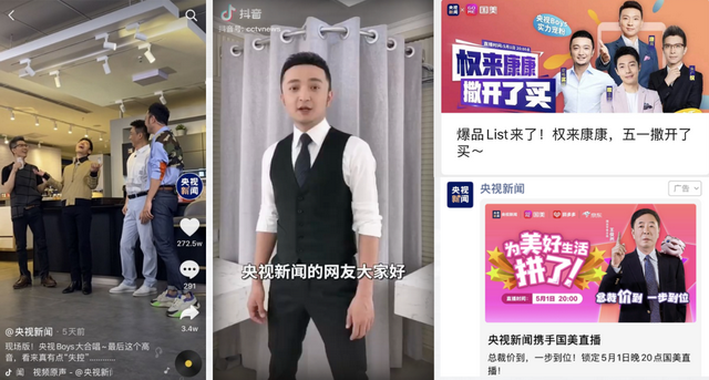 2020年4月以来,央视新闻、央视财经、央视频等总台新媒体平台凭借多年的大型节目组织经验和强大的团队资源,在短短8个月就策划和举办了30场以上的大型直播带货活动并火爆全网,销售额超过100亿。