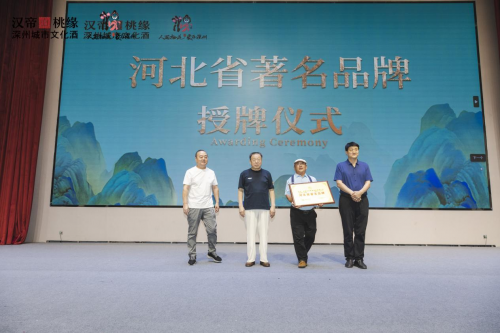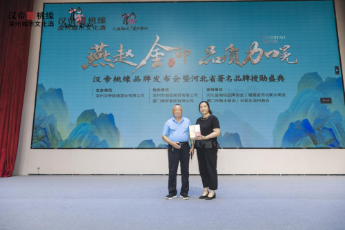 在河北省著名品牌评审委员会专家/衡水市场监管局原副局长杨德魁、辛集市场监督管理局原局长/河北省著名品牌评审委员会专家赵晓、福建省衡水商会副会长/秘书长孙占华、海梦集团合伙人/厦门市河北商会副秘书长王璐、汉帝桃缘股东代表/深州城投商贸董事长张梓瑶、汉帝桃缘董事/深州城投代表郭海珠、汉帝桃缘城市合伙人薛帅、张良子酒业创始人张建雷、海梦集团董事长/汉帝桃缘IP智造者张朝等共同见证下,河北省商标品牌协会会长庞红军为海梦集团合伙人/汉帝桃缘董事长孙志祥进行了“河北省著名品牌”授牌。“河北省著名品牌”这块沉甸甸的金字招牌,是对汉帝桃缘产品品质、市场口碑、品牌影响力的最高认可之一,是名副其实的“燕赵金印”!